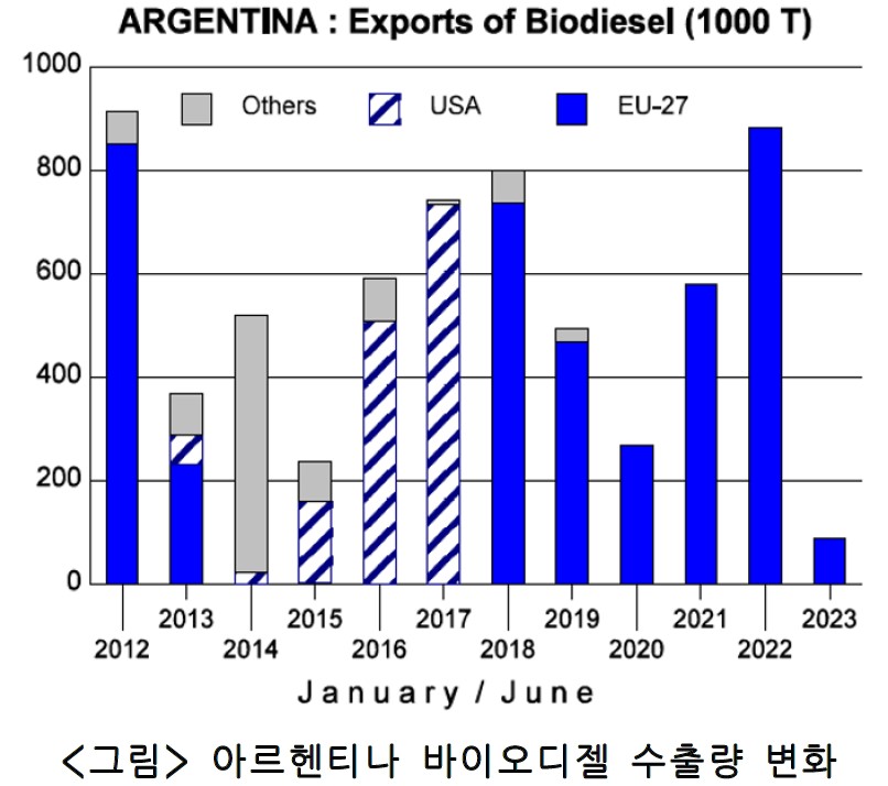 ▶ EU의 가라앉은 수입 수요로 인해 2023년 1월∼6월간 아르헨티나 바이오디젤 수출량은 단지 90,000∼100,000톤으로 억제되었습니다(1년 전 수출량 0.88백만톤).