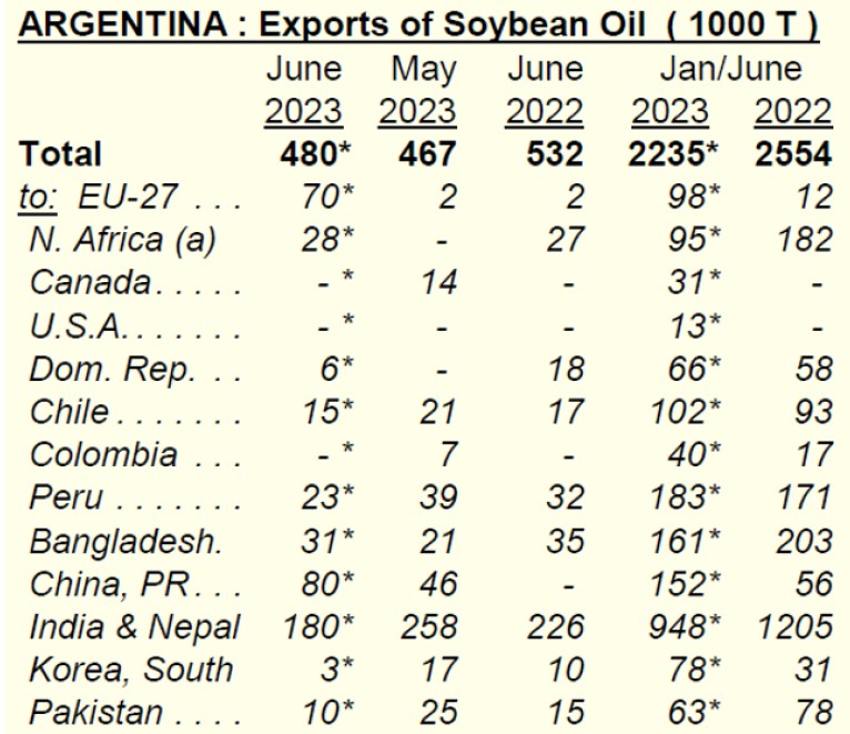 - 인도는 6월에 아르헨티나 soya oil의 최대 수출 행선지였고, 그 뒤를 중국과 EU가 잇고 있습니다.