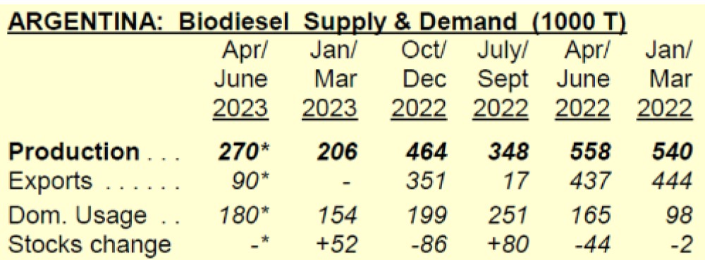 ▶ 2023년 1월∼6월간 아르헨티나의 바이오디젤 생산량은 수년간 최저인 단지 약 0.48백만톤으로 감소했습니다(1년 전 수준의 43%).