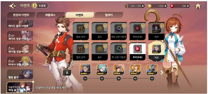 - 획득한 영웅 소환권과 루비를 사용하여 영웅을 소환합니다. 일반적으로 2~3회의 10연차 뽑기가 가능합니다.