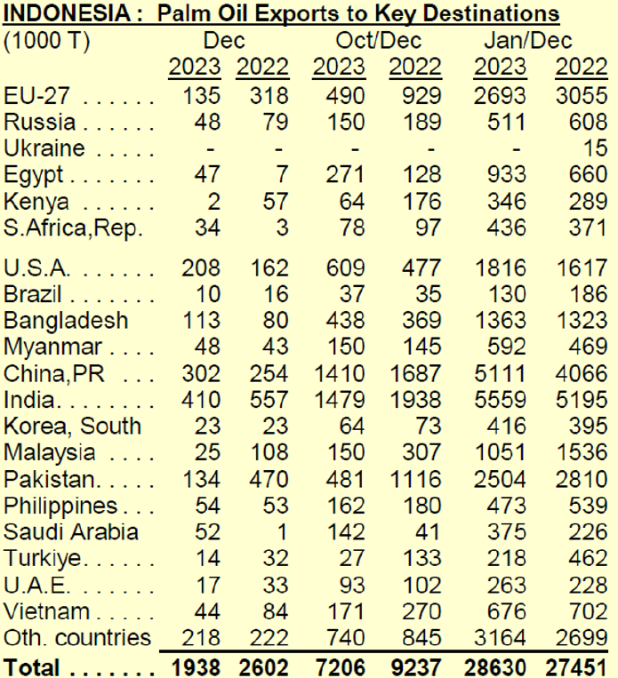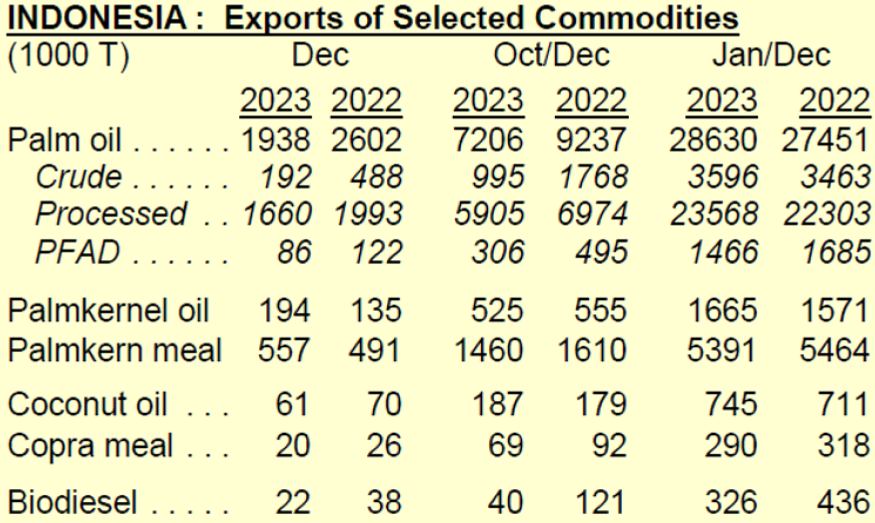 2023 12월 팜유 수출량은 7개월간 최저인 1.94백만톤으로 확인되었습니다.