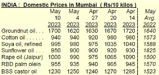 지금까지 인도 정부는 식물성 오일에 대한 수입 관세 인상 요구를 들어줄 생각이 없는 것으로 보입니다. 인도 도매 시장에서 5월 10일까지 2주 동안 주요 식용 오일 가격은 회복되었으며, 세계 시장에서 상승 경향과 일치했습니다. 식용 오일 가격은 1년 전 수준보다 33%(rapeseed oil), 48%(sun oil) 낮은 상태임. 단지 groundnut oil이 작년 5월 가격보다 높게 제시되고 있습니다.