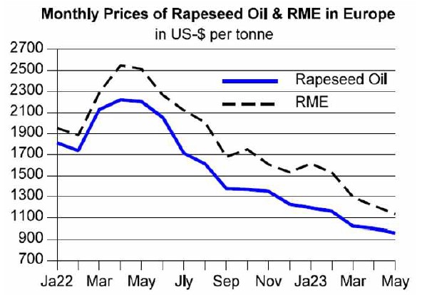 바이오디젤 가격은 금주 지금까지 현저하게 하락했습니다. RME(rapeseed oil methly ester) 가격은 약 1,000$로 제시되었으며, 4월 평균가 1,212$ 및 2022년 5월 수립한 2,514$의 고가와 비교되고 있습니다.