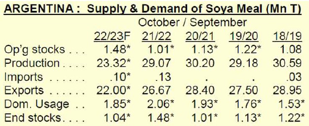4월∼9월간 아르헨티나 soybean 가공량은 1년 전보다 4.5∼5.0백만톤 감소할 것으로 예상됩니다. 2022/23시즌 아르헨티나 soya meal 수출량을 22.0백만톤으로 추정됩니다. (1년 전, 수출량 26.7백만톤)
