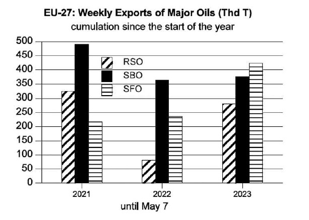 비교적 낮은 가격에 의해 증가가 예상되어진 EU rapeseed oil는 수출량에서 아직 예상되었던 상당한 증가는 보여지지 않고 있습니다. 실제로, EU 위원회가 발표한 예비 무역자료에 따르면, 5월 7일까지 5주 동안 선적 물량은 심지어 둔화되고 있습니다. 1월 이후 rapeseed oil 누적 수출량은 0.28백만톤에 도달했으며, 이는 전년대비 증가이나 2021년 기록된 수준보다 여전히 13% 적음습니다.