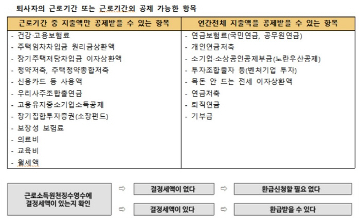 - 보험료, 의료비, 교육비, 신용카드 사용액 등은 근무 기간 동안 지출한 금액만 공제 대상입니다.