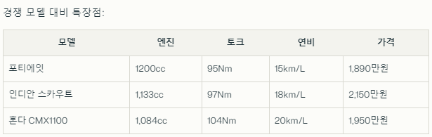 - 단점: 좁은 연료탱크, 장거리 주행 편의성 부족