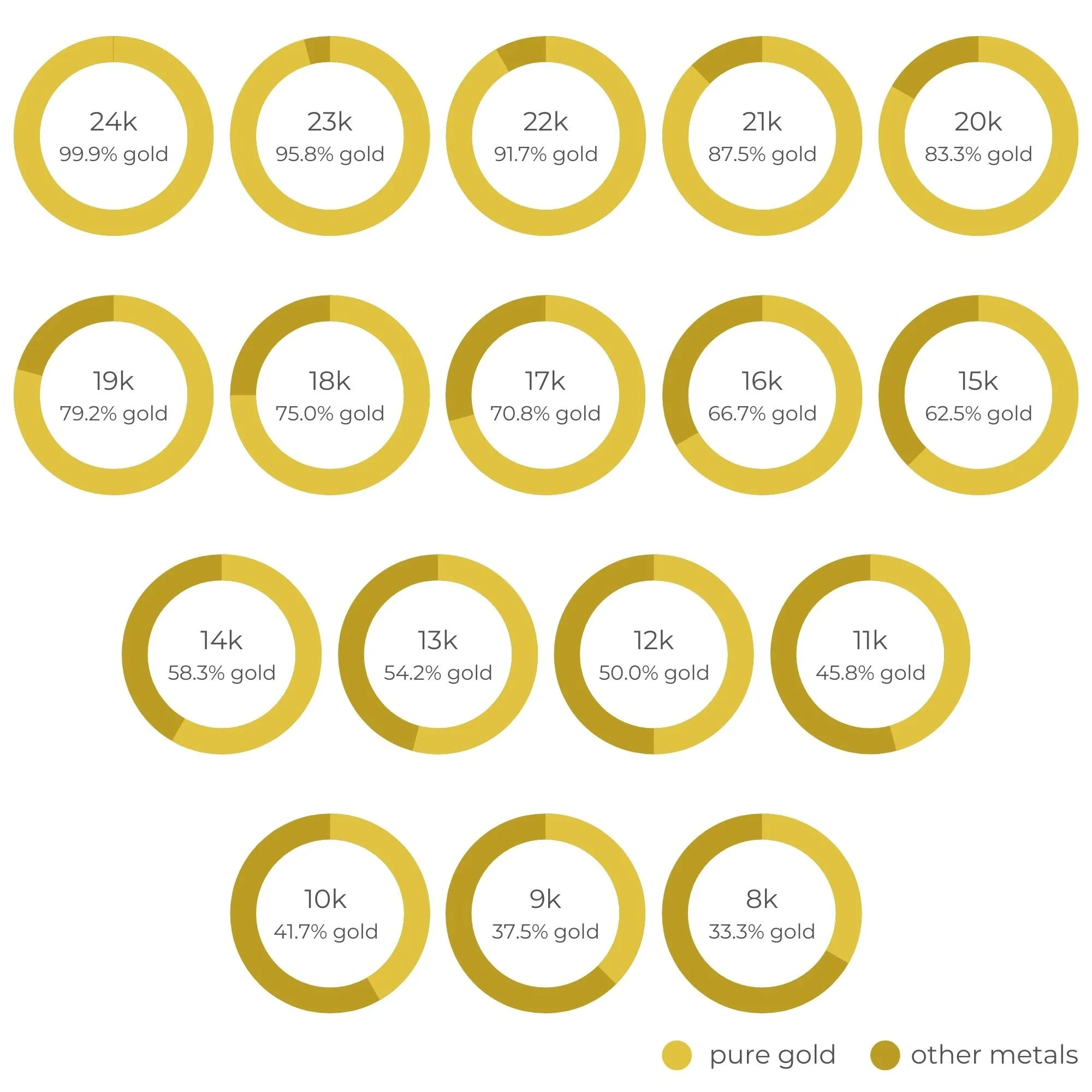 14K 금은 순금(24K)이 58.3% 함유되어 있고, 나머지 41.7%는 다른 금속(주로 은, 구리, 아연, 니켈 등)으로 이루어진 합금입니다. 순금은 무르고 변형되기 쉬운 단점이 있지만, 14K 금은 다른 금속과의 합금을 통해 내구성을 높여 일상생활에서 착용하기에 적합합니다. 이러한 특성 덕분에 14K 금은 주얼리, 특히 반지나 목걸이처럼 자주 착용하는 액세서리에 널리 사용됩니다.