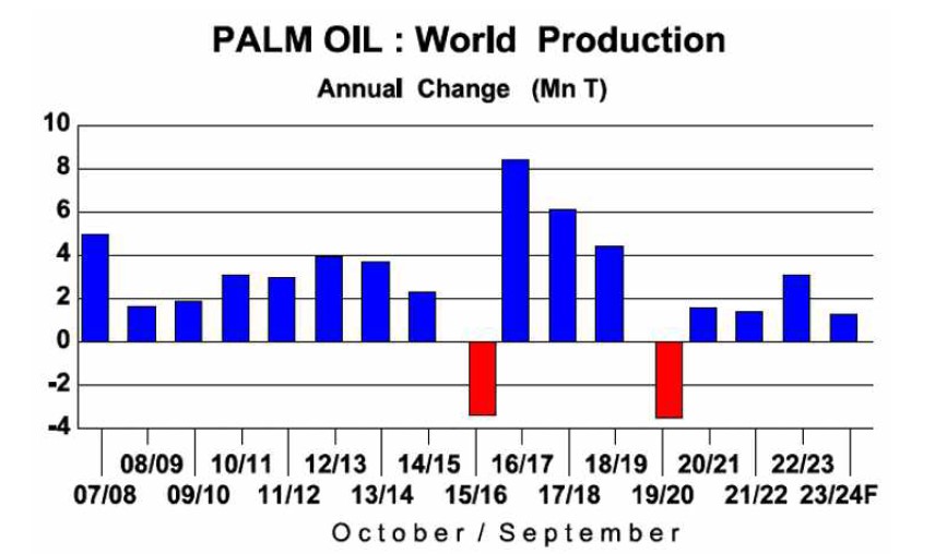 2023년 10월∼2024년 9월 시즌 세계 팜유 생산량이 단지 1.3백만톤 증가하여 82.0백만톤에 도달할 것으로 예측하고 있습니다. 주로 인도네시아 생산량이 증가할 것이며, 말레이시아와 태국의 생산량은 사실상 정체되고 중앙아메리카와 아프리카 생산량이 약간 증가할 것으로 예상됩니다. 그러나 엘니뇨 현상이 가뭄 피해로 이어진다면 이는 변할 수 있을 겁니다.