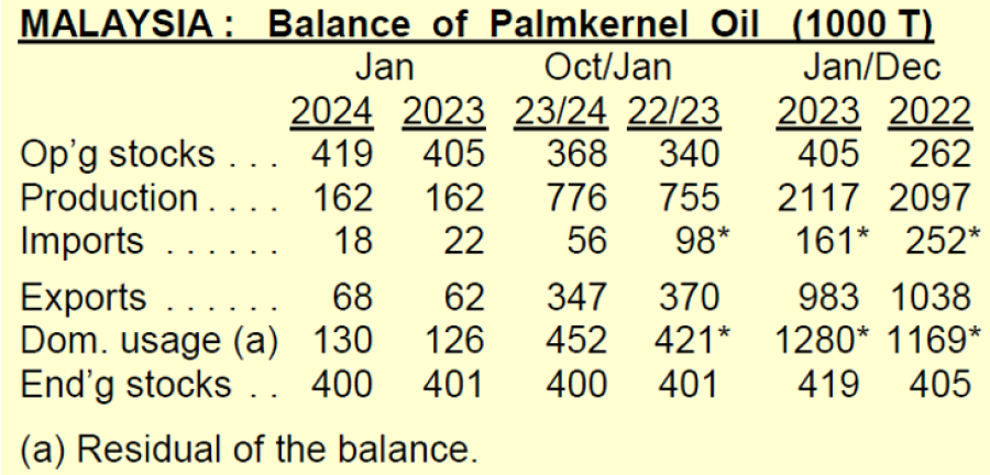 1월 말 기준 palmkernel oil의 재고량은 4개월 동안의 최저 수준인 400,000톤으로 감소했으며,