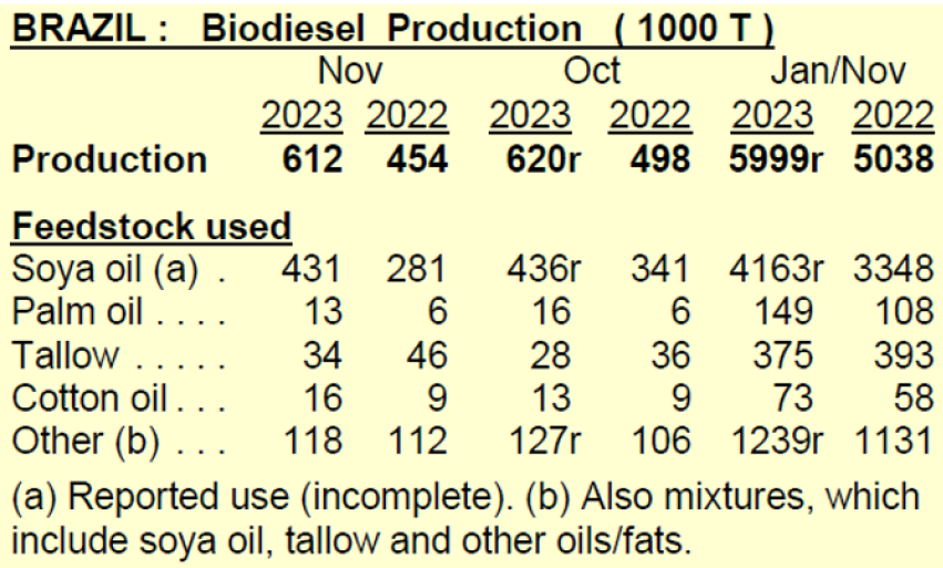 ▶ 2023년 11월 브라질 바이오디젤 생산량은 612,000톤으로 발표되었으며, 1년 전 낮았던 수준을 35% 초과했음