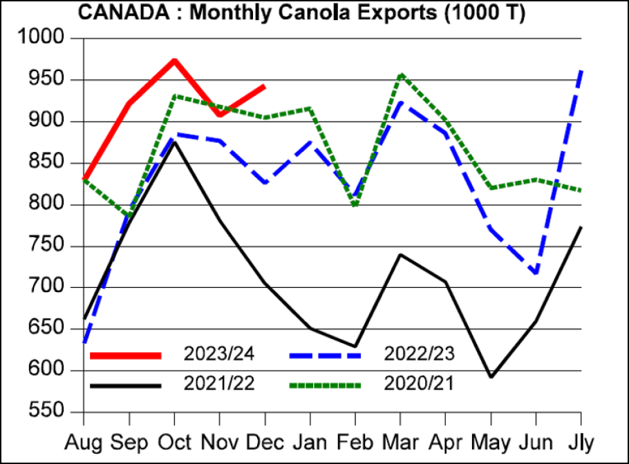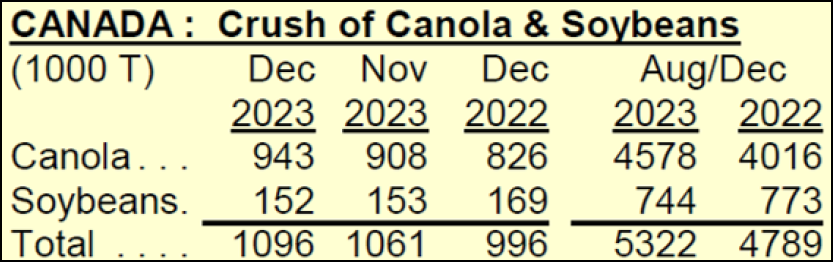 ▶ 12월 canola 가공량은 943,000톤으로 1년 전 수준을 현저하게 초과했음
