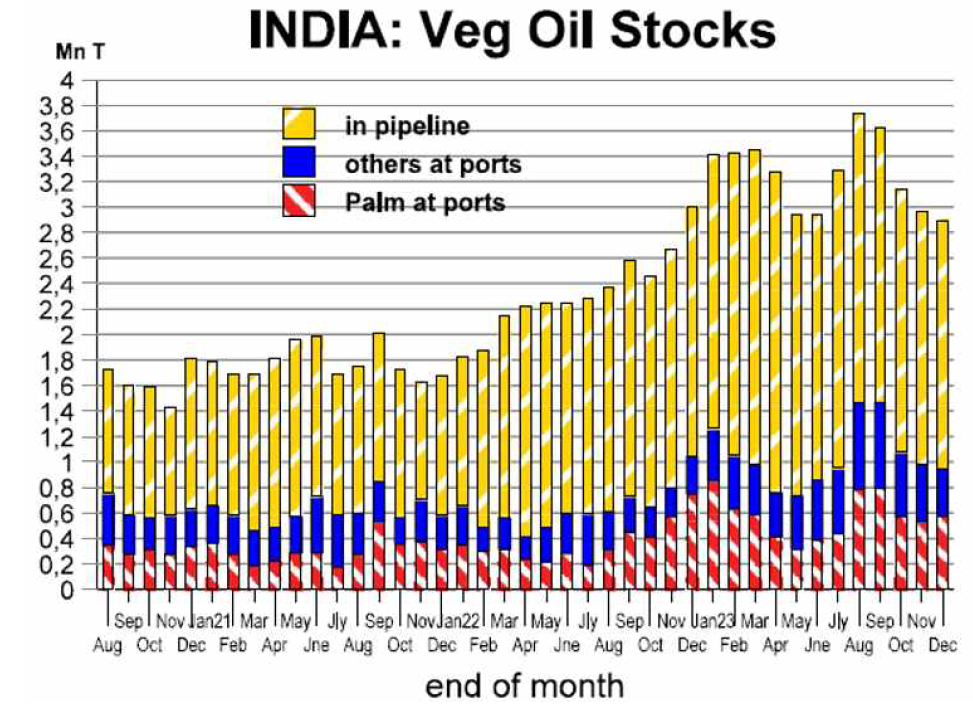 - 수입 둔화는 지난 4개월간 동안 인도 식물성 오일 재고량의 눈에 띄는 감소로 이어졌습니다. 12월 말 현재 항구와 파이프라인에서 재고량은 1년간 최저인 2.9백만톤으로 떨어졌으며, 8월 말 재고량 3.7백만톤과 비교됩니다.