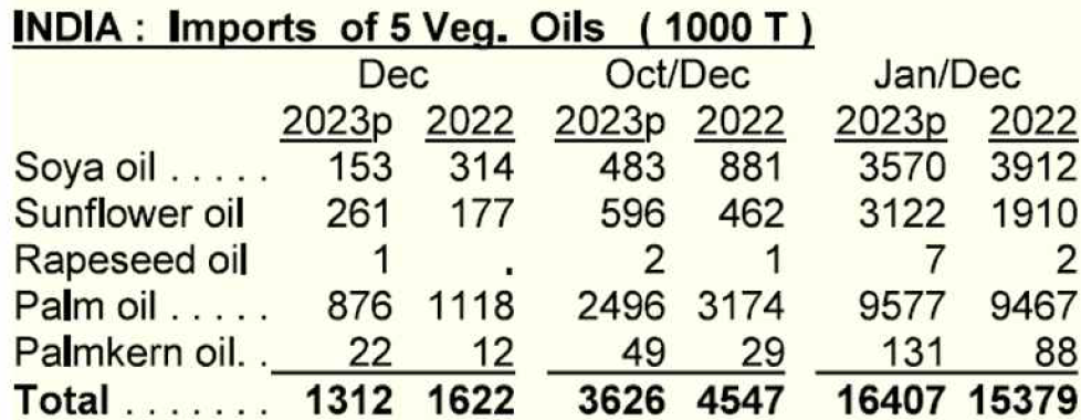 ▶ 인도의 5개 식물성 오일 수입량은 12월에 0.3백만톤 감소했고, 2023년 10월∼12월간 0.9백만톤 감소했음