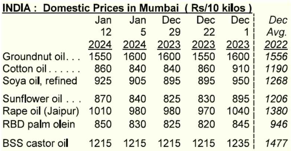 - SEA(인도 유지추출협회)가 발표한 예비 자료에 근거하여, 인도의 5개 식물성오일 수입량은 12월에 0.3백만톤 감소했고, 2023년 10월∼12월간 0.9백만톤 감소했습니다. 지난 분기에 팜유와 soya oil 수입량은 각각 0.7백만톤, 0.4백만톤 감소했으며, sun oil 수입량에서 0.13백만톤 증가는 이를 단지 부분적으로 상쇄했습니다. 12월 palm kernel oil 수입량은 2년간 최고 수준인 23,000톤으로 뛰어올랐으며(주로 말레이시아로부터 수입), 매력적인 가격에 의해 증진되었습니다.