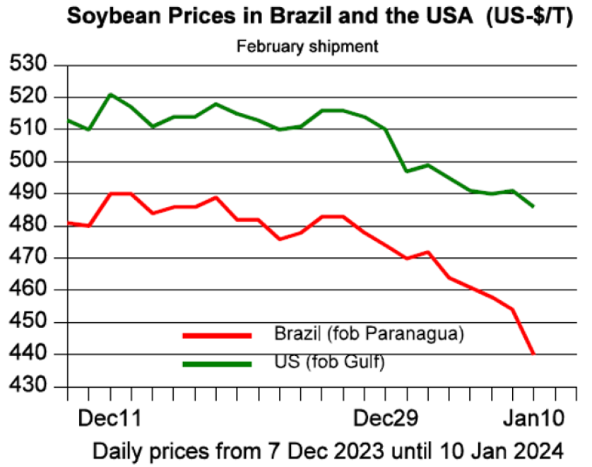 - 브라질 soybean은 미국산과 비교하여 경쟁력을 개선했습니다. 브라질 soybean 수출 가격(2월 선적분)은 약 440$로 떨어졌으며, 이리하여 미국 soybean(fob Gulf)보다 46$ 낮게 제시되었습니다. 중국은 브라질산 soybean 구매를 재개했습니다(7개 화물이 확인되었고 더 많은 구매가 있을 것).