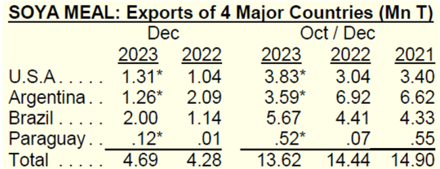 - 12월에 미국과 남아메리카 3개국의 합친 soya meal 수출량은 예상을 초과했으며, 심지어 전년대비 증가를 보였습니다. 미국과 브라질 수출량의 증가 규모는 정말로 놀라웠으며, 가공량 증가 및 국내 소비량 감소가 이를 가능하게 만들었습니다.