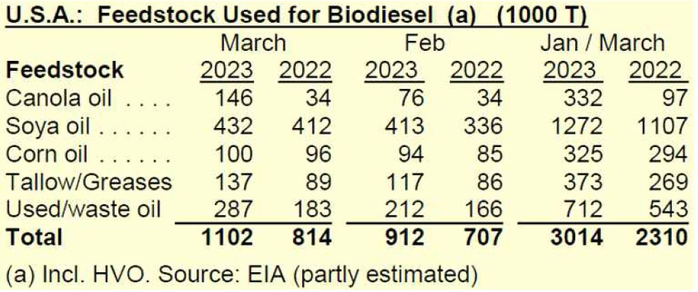 2023년 1월∼3월간 원료 혼합에서 soya oil의 점유율은 48%로 줄어들었습니다. (1년 전 42%) soya oil에 대한 줄어들고 있는 의존도는 최근 몇 주간 미국 soya oil 가격에 기여했으며, 앞으로 soybean 가공량 둔화에 영향을 미칠 것으로 예상됩니다.