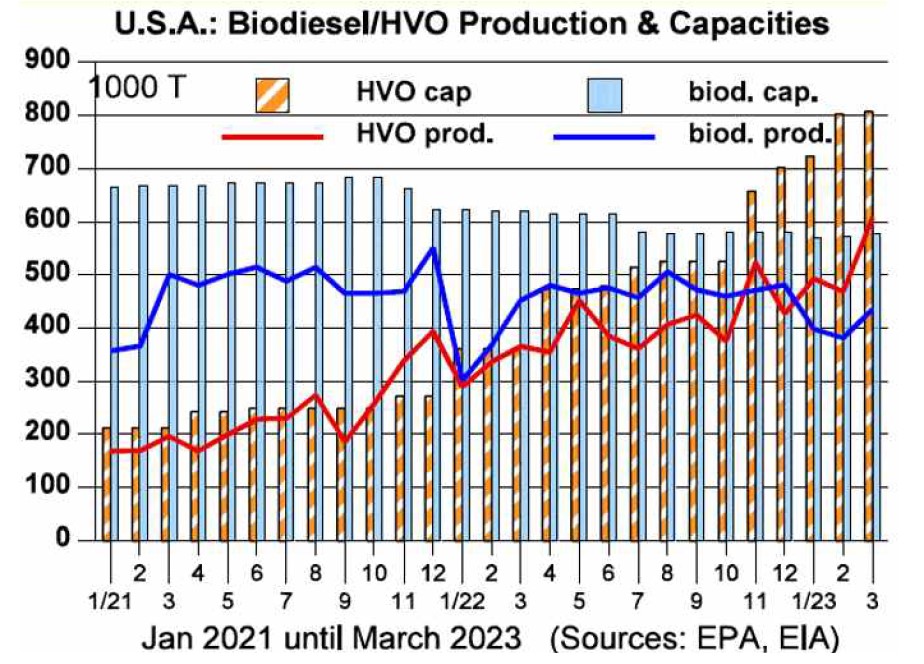 EIA(미 에너지 정보청)에 따르면, 2023년 3월 현재 신재생디젤/HVO 생산 용량은 월간 807,000톤으로 1년 사이에 2배 이상 늘어났습니다. 대조적으로, 바이오디젤 생산 용량은 579,000톤으로 6∼7% 감소했습니다. 두 부문에서 3월 가동률은 약 75%에 도달했습니다. 생산 용량의 빠른 확대는 이 1년 동안 HVO(Hydrotreated Vegetable Oil) 생산 붐과 일치하는 경향을 보이고 있습니다.