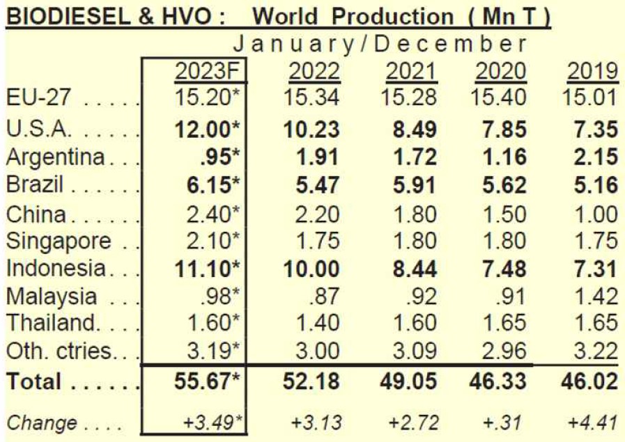미국, 인도네시아 및 브라질에서 바이오디젤과 HVO(Hydrotreated Vegetable Oil) 생산량은 현저하게 증가하고 있습니다. (아르헨티나는 예외) 2023년 세계 생산량 추정치는 55.7백만톤으로 상향 조정될 것이며, 이는 전년대비 3.5백만톤 증가이고 3년 전보다 9.3백만톤 많은 양입니다.