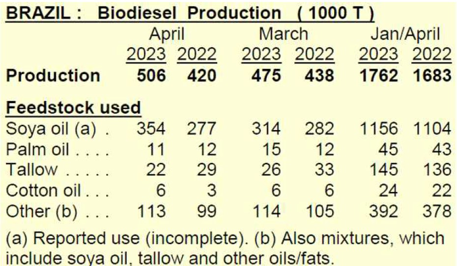 12%로 인상된 바이오디젤 혼합비에 의해, 4월 바이오디젤 생산량은 506,000톤으로 증가했습니다. 이는 B10이 시행되었던 1년 전 생산량 420,000톤과 비교됩니다. 4월에 원료로서 soya oil의 점유율은 70%로 증가했고, 팜유와 tallow 이용량은 감소했습니다.