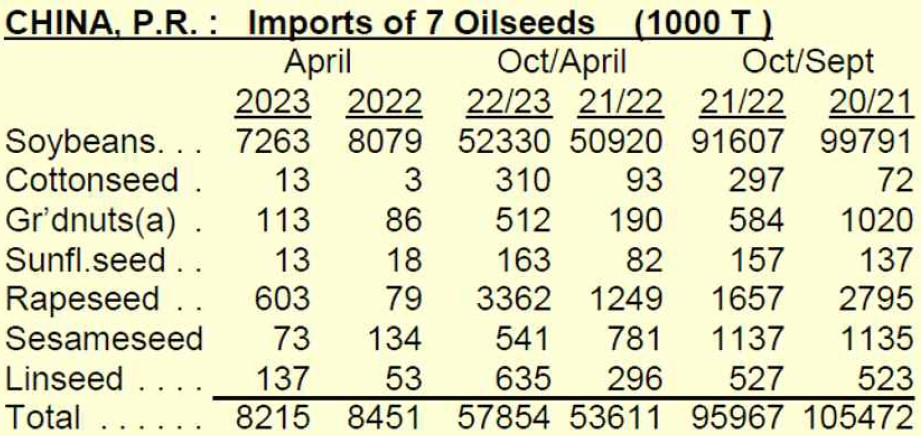 4월 soybean 수입량은 검사 절차의 지연으로 인해 감소했으며, 중국 항구에서 선박의 긴 대기 행렬을 초래했고 5월 수입량 증가로 이어질 것으로 예상됩니다. 하지만 4월에 다른 oilseed 수입량(1차적으로 rapeseed와 linseed)은 증가했습니다.