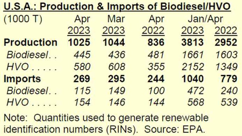 4월 HVO 생산량은 580,000톤에 도달했으며, 3월과 비교하면 5% 감소이나 4월 생산량만 따지면 신기록입니다. 2023년 1월∼4월간 신재생 디젤 생산량은 2.15백만톤의 신기록을 기록했고(60% 증가), methyl ester 생산량은 단지 4% 증가하여, 미국 바이오디젤 생산량 중에 HVO의 점유율을 56%로 올려 놓았습니다.