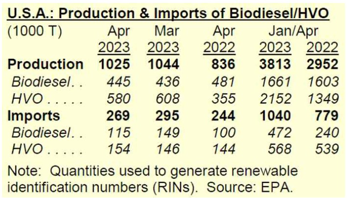 4월 HVO 생산량은 580,000톤에 도달했으며, 3월로부터 5% 감소이나 4월 생산량으로 여전히 신기록입니다. 2023년 1월∼4월간 신재생 디젤 생산량은 2.15백만톤의 신기록으로 급증한 반면(60% 증가), methyl ester 생산량은 단지 4% 증가하여, 미국 바이오디젤 생산량 중에 HVO의 점유율을 56%로 올려 놓았습니다.