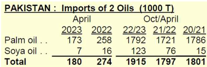4월 soya oil 수입량은 7,000톤으로 또한 적었으며, 국내 soya oil 생산량의 심각한 감소로 문제가 되고 있습니다. 유전자 조작 oilseed 수입 면허 발급에 관하여 아직 해결되지 않은 문제로 인해 파키스탄의 soybean 수입은 최근 정지 상태에 이르렀습니다. 이는 올해 지금까지 파키스탄 soybean 가공업자 들에게 심각한 타격을 가져왔음.