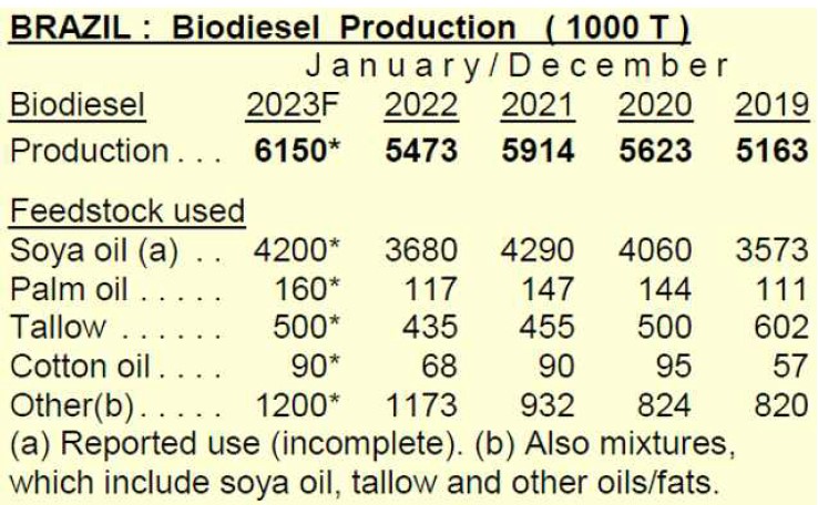 ▶ 2023년 브라질 바이오디젤 생산량은 6.15백만톤으로 증가할 것으로 예상됩니다.
