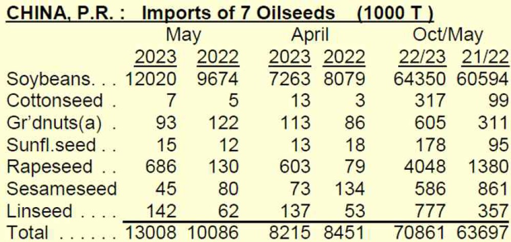 5월 rapeseed & canola 수입량은 686,000톤의 사상 최고치에 도달했으며(캐나다로부터 672,000톤 수입), 2022년 10월∼2023년 5월간 누적 수입량을 4.05백만톤으로 올려놓았습니다(1년 전 수입량보다 거의 3배 많음). 이는 예상보다 많은 가공량과 2022/23시즌 국내 rapeseed 생산량 감소 또는 재고량 축적을 보여주는 지표가 될 것입니다.