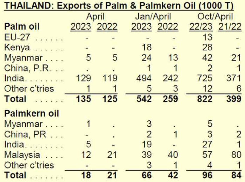 4월 팜유 수출량은 135,000톤으로 꽤 높게 유지되었고, 2022년 10월∼2023년 4월간 누적 수출량은 822,000톤으로 1년 전보다 2배 이상 많아졌습니다. 최근에 인도가 다시 주요 수출 행선지였으며, 이 기간 인도로 누적 수출량은 725,000톤에 달합니다.