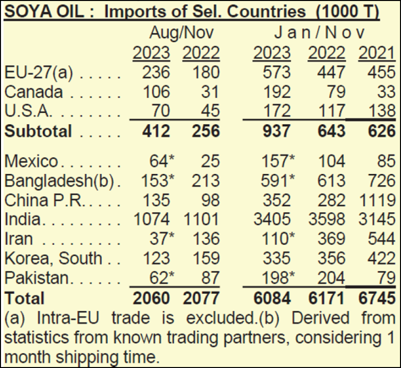 - 2023년 1월∼11월간 EU, 캐나다 및 미국의 합친 soya oil 수입량은 0.94백만톤으로 46% 증가했습니다. 이 3개 수입국들로부터 이러한 수요 당기기(demand pull)는 세계 수출 공급량을 제한했으며, 인도 및 이란과 같은 다른 국가들의 soya oil 수입량이 상당히 감소하는 데 기여했고, sun oil 및 팜유로 부분적인 전환을 초래했습니다.