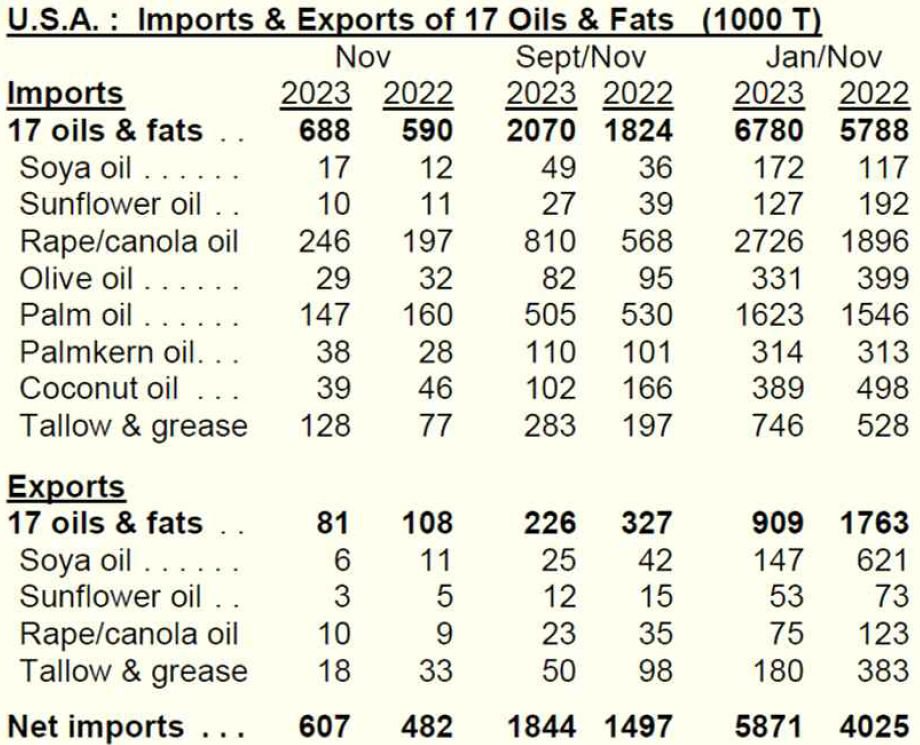 - 바이오연료 업계의 강한 수요는 11월 미국의 tallow & greases 수입량을 128백만톤의 신기록으로 증진했으며(66% 증가), 호주, 브라질 및 캐나다로부터 각각 59,000톤, 30,000톤, 18,000톤을 수입했습니다.