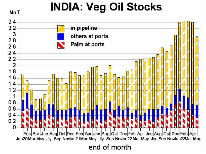 5월 말 현재 인도 항구에서 식물성 오일 재고량은 7개월간 최저인 0.74백만톤으로 약간 줄어들어 있는 상황입니다. sun oil 재고량 증가는 팜유와 soya oil 재고량 감소를 상쇄할 수는 없습니다. 국내 파이프라인 재고량이 두드러지게 감소했음과 더불어, SEA는 5월 말 현재 식물성 오일 총 재고량을 2.9백만톤으로 유지하였습니다(이전 4개월간 약 3.4백만톤에서 감소했으나, 1년 전 2.2백만톤을 초과했습니다).