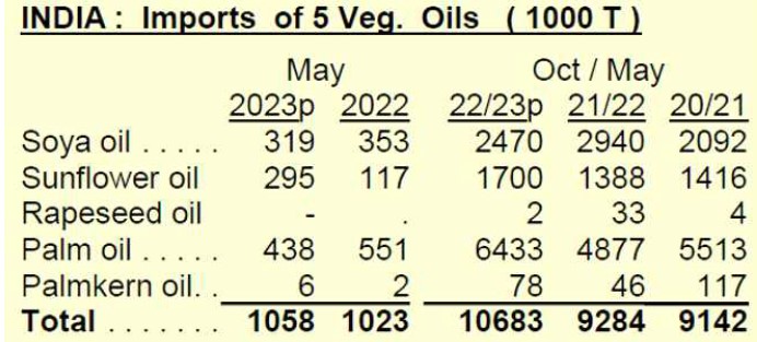 매력적인 가격으로 제시된 sun oil과 soya oil은 최근 달들에 시장 점유율을 얻고 있습니다. 2022년 10월∼2023년 5월간 sun oil 수입량은 1.7백만톤으로 23% 증가했습니다. 주요 국가들로부터 sun oil 수입량은 다음과 같습니다. : 러시아 435,000톤(1년 전 228,000톤), 우크라이나 441,000톤(1년 전 939,000톤), 아르헨티나 180,000톤(1년 전 171,000톤), EU 494,000톤(1년 전 24,000톤), 튀르키예 136,000톤(1년 전 12,000톤)