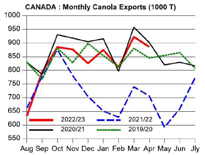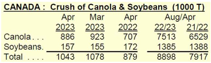 ▶ 4월 canola 가공량은 0.89백만톤으로 계절적으로 감소했으나(전월대비 4% 감소), 1년 전 0.71백만톤의 적었던 수준보다 여전히 현저하게 많은 상황입니다.