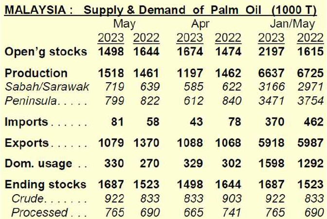 5월 말 시점에 팜유 재고량은 1.69백만톤으로 회복되었습니다. 5월 수출량은 1.08백만톤으로 비교적 적었고(1년 전보다 0.3백만톤 적음), 한편 수입량은 81,000톤으로 증가했습니다.