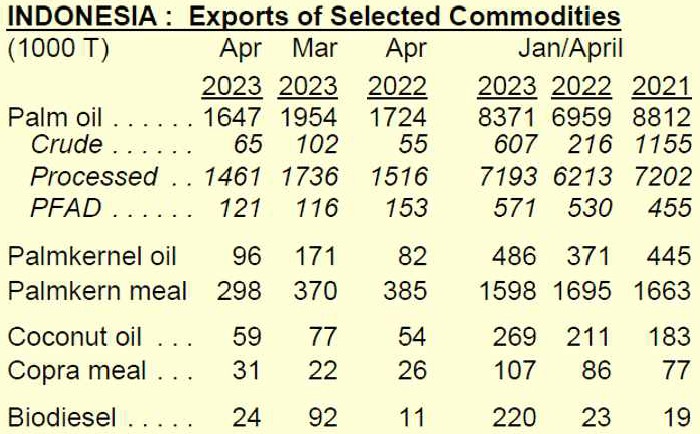 4월 팜유 수출량은 1.65백만톤으로 감소했으나, 정부가 수출 관세와 분담금을 각각 33$, 85$로 낮추었음에 따라(이전에 74$, 95$와 비교됨) 앞으로 몇 달간 수출량은 상당히 증가할 것으로 보입니다. 2023년 전기간 인도네시아 팜유 수출량이 27.0백만톤에 도달할 것으로 예측하며, 이리하여 작년 수출량 27.45백만톤보다 조금 적을 것입니다.