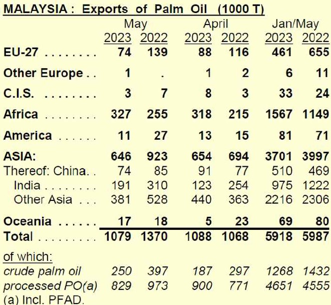 2023년 1월∼5월 동안 말레이시아의 팜유 총 수출량은 5.92백만톤으로 1년 전으로부터 단지 1% 소폭 감소했습니다. 인도로 수출량은 975,000톤으로 크게 감소했고(1년 전, 1,222,000톤), 한편 중국으로 선적 물량은 510,000톤으로 회복되었습니다(1년 전 469,000톤). EU로 수출량은 전년대비 30% 현저하게 감소하여 461,000톤에 도달했습니다. 그러나 나이지리아, 베넹, 토고, 세네갈, 케냐 및 다른 여러 국가들로 상당히 늘어난 수출량이 기록되었으며, 아프리카 대륙으로 말레이시아 팜유 총 수출량을 1.57백만톤으로 올려놓았습니다(36% 증가).