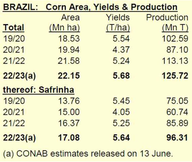 브라질에서 soybean과 옥수수의 합친 생산량은 저장 능력보다 훨씬 빠르게 증가했습니다. 올해 초에 157백만톤으로 추정되는 기록적인 soybean 생산량(최근 5년간 평균치 129백만톤과 비교됨) 이후, 기록적인 safrinha 옥수수 생산량이 이어질 것으로 보입니다. CONAB은 올해 safrinha 옥수수 생산량을 96.3백만톤으로 추정했으나, 여러 민간 추정치들은 실제 생산량이 100백만톤에 육박하거나 이를 약간 초과할 것을 시사하고 있습니다. 6월 17일 현재 옥수수 수확은 재배 면적의 약 5%에서 진행되었습니다(작년 같은 시기 11%와 비교됨).