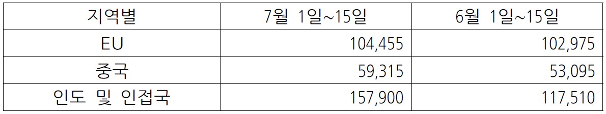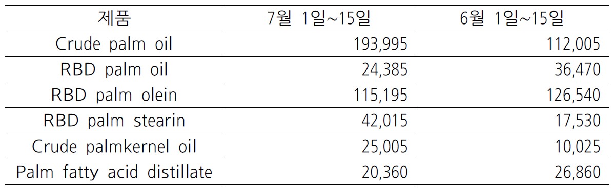 7월 15일, 7월 1일∼15일간 말레이시아 팜유 수출량은 19.3% 증가