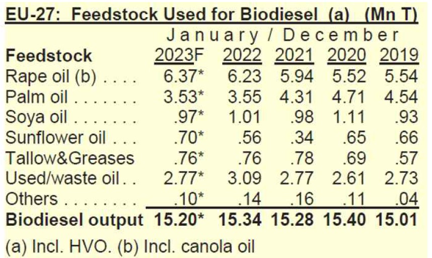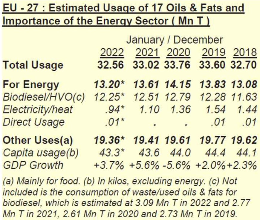 현재, 2022년 10월∼2023년 9월 시즌 EU의 17개 oils & fats 총 소비량을 32.56백만톤으로 예측하고 있으며, 이는 지난 시즌으로부터 0.3백만톤 감소한 수치입니다. 감소 요인은 위에서 언급한 부진한 수요가 주된 이유입니다. 더욱이, 석유 회사들이 최근 몇 해동안 바이오연료 혼합 의무의 초과 이행으로 축적된 credit을 현재 이용하고 있으며, 이는 바이오디젤 수요를 추가로 압력을 가했습니다.