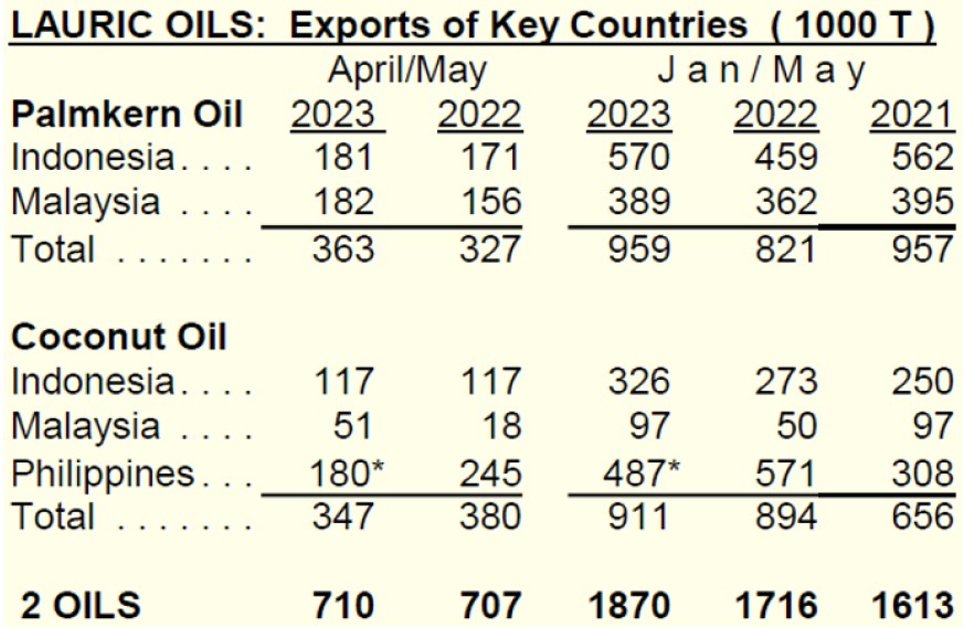 ② lauric oil의 풍부한 수출 공급량은 oleochemical(천연화학)과 식품 부문에서 다소 부진한 세계 수요와 최근 대조되었습니다. 2023년 1월∼5월간 주요 생산국들로부터 coconut oil과 palm kernel oil의 합친 수출량은 전년대비 9% 증가했으며, 부분적으로 수입국들에서 재고량 증가로 이어졌습니다.